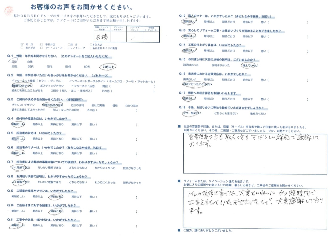 トイレの改修工事では大変ていねいに かつ短時間で工事を行っていただきましたので、大変感謝しております。