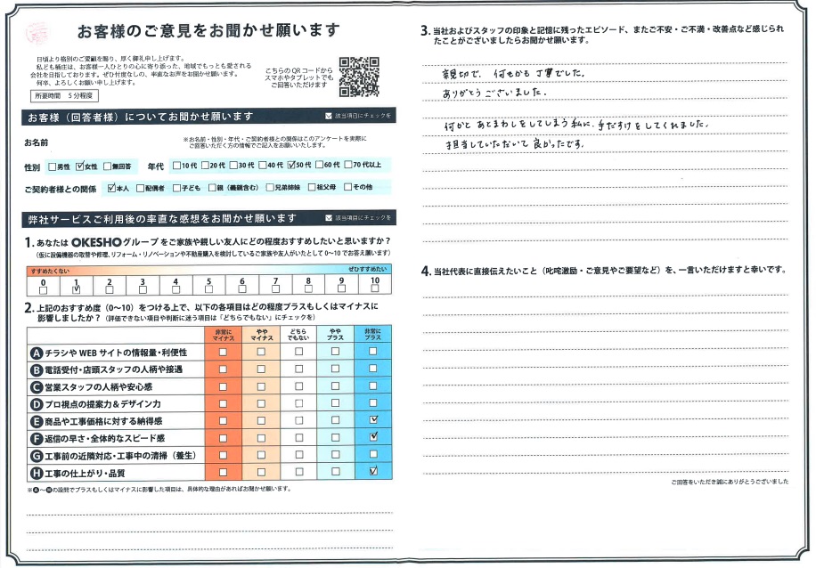 当社およびスタッフの印象と記憶に残ったエピソード、またご不安・ご不満・改善点など感じられたことがございましたらお聞かせ願います。