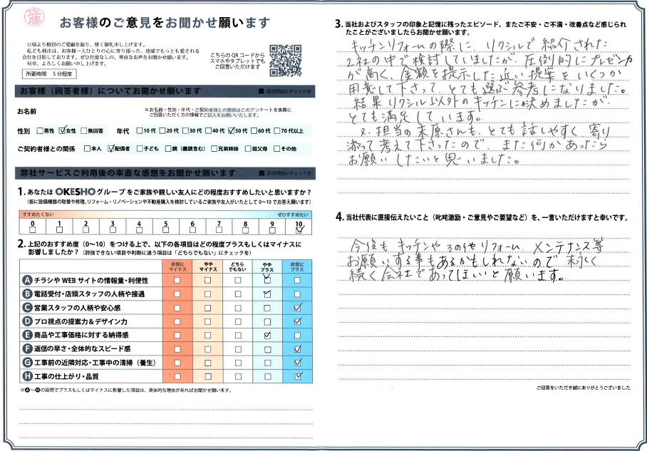キッチンリフォームの際に、リクシルで紹介された2社の中で検討していましたが、圧倒的にプレゼン力が高く、金額を提示した近い提案をいくつか用意して下さって、とても選ぶ参考になりました。