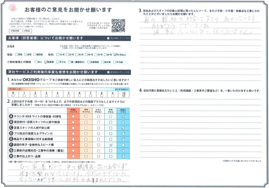 当社およびスタッフの印象と記憶に残ったエピソード、またご不安・ご不満・改善点など感じられたことがございましたらお聞かせ願います。
