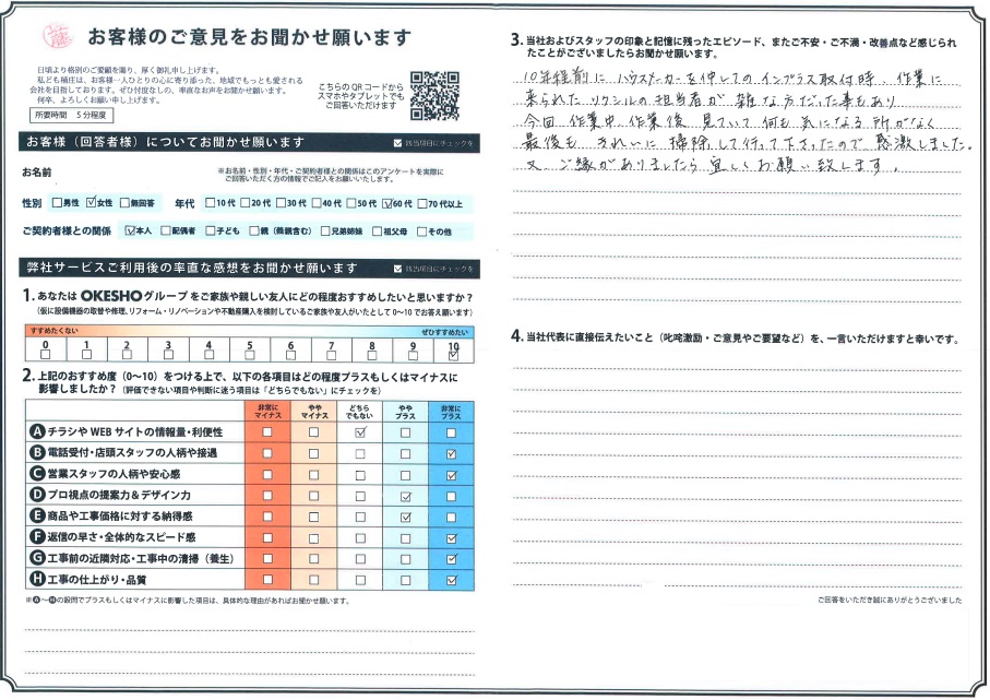 当社およびスタッフの印象と記憶に残ったエピソード、またご不安・ご不満・改善点など感じられたことがございましたらお聞かせ願います。