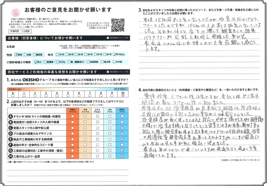 浴室暖房が長く保ったとは云え対応にやや不満でしたが、相見積りの積りで浴室の見積りを紹介したところ、営業マンの方が非常に親切丁寧な対応で特に補助金が国から出る事や、バリアフリーの可能性の研究、浴室の経済性等顧客満足度が第一と云われますが、ここまで徹底している会社は見た事が無く御社に決めました。