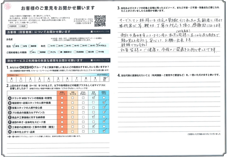 当社およびスタッフの印象と記憶に残ったエピソード、またご不安・ご不満・改善点など感じられたことがございましたらお聞かせ願います。