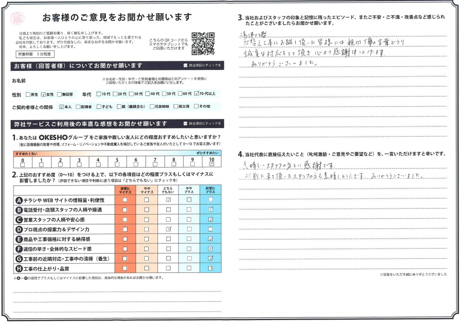 当社およびスタッフの印象と記憶に残ったエピソード、またご不安・ご不満・改善点など感じられたことがございましたらお聞かせ願います。