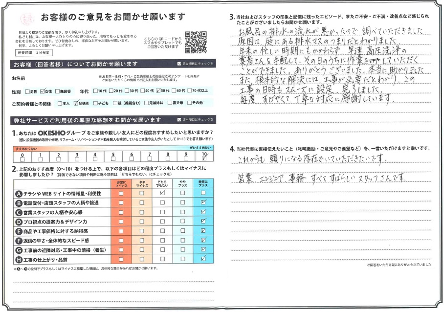 お風呂の排水の流れが悪かったので調べていただきました。