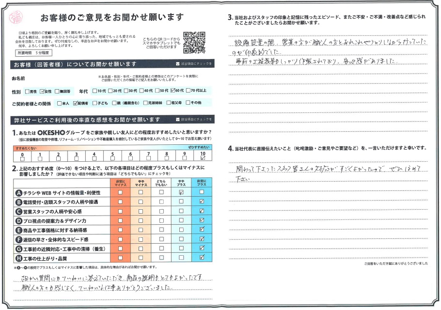 当社およびスタッフの印象と記憶に残ったエピソード、またご不安・ご不満・改善点など感じられたことがございましたらお聞かせ願います。