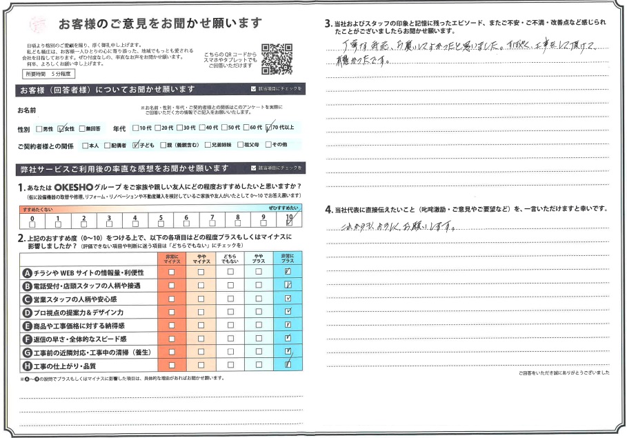 当社およびスタッフの印象と記憶に残ったエピソード、またご不安・ご不満・改善点など感じられたことがございましたらお聞かせ願います