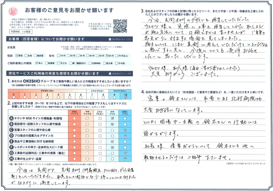 当社およびスタッフの印象と記憶に残ったエピソード、またご不安・ご不満・改善点など感じられたことがございましたらお聞かせ願います。