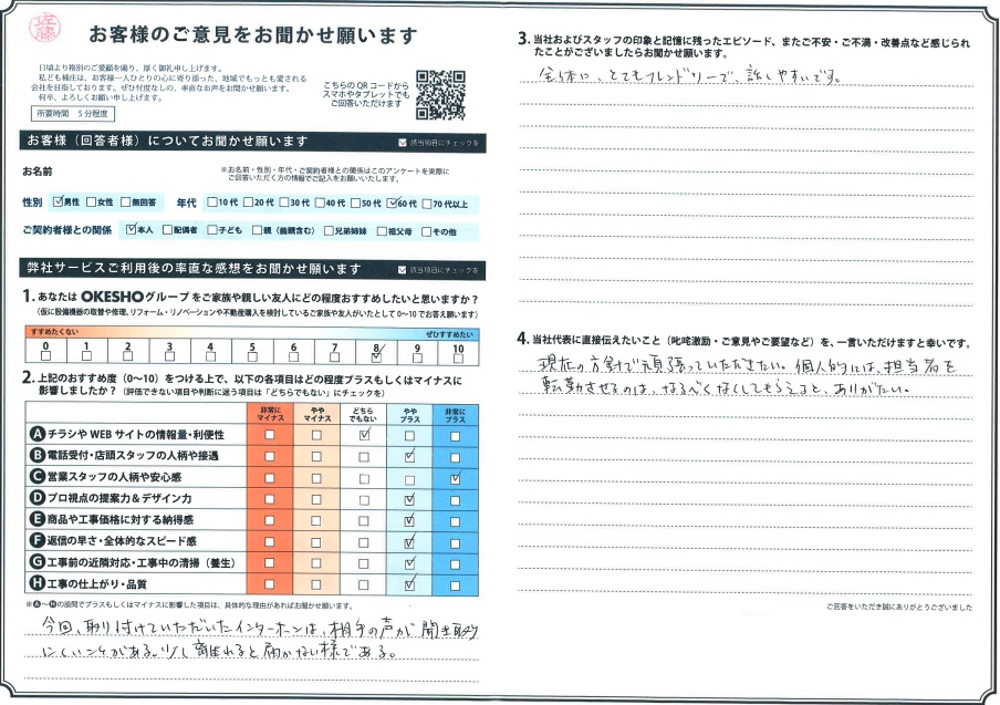 当社およびスタッフの印象と記憶に残ったエピソード、またご不安・ご不満・改善点など感じられたことがございましたらお聞かせ願います。