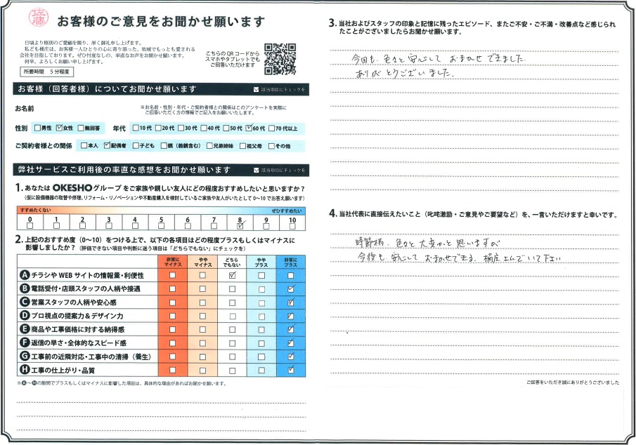 当社およびスタッフの印象と記憶に残ったエピソード、またご不安・ご不満・改善点など感じられたことがございましたらお聞かせ願います。