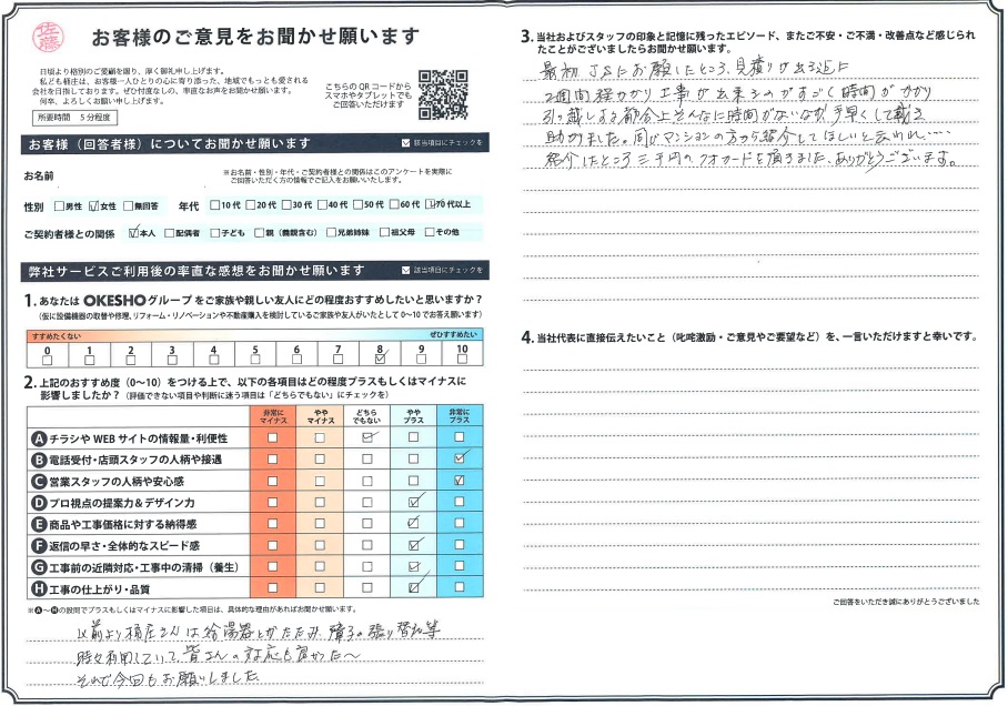 当社およびスタッフの印象と記憶に残ったエピソード、またご不安・ご不満・改善点など感じられたことがございましたらお聞かせ願います。