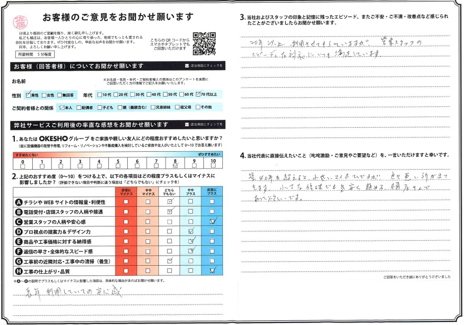 当社およびスタッフの印象と記憶に残ったエピソード、またご不安・ご不満・改善点など感じられたことがございましたらお聞かせ願います。
