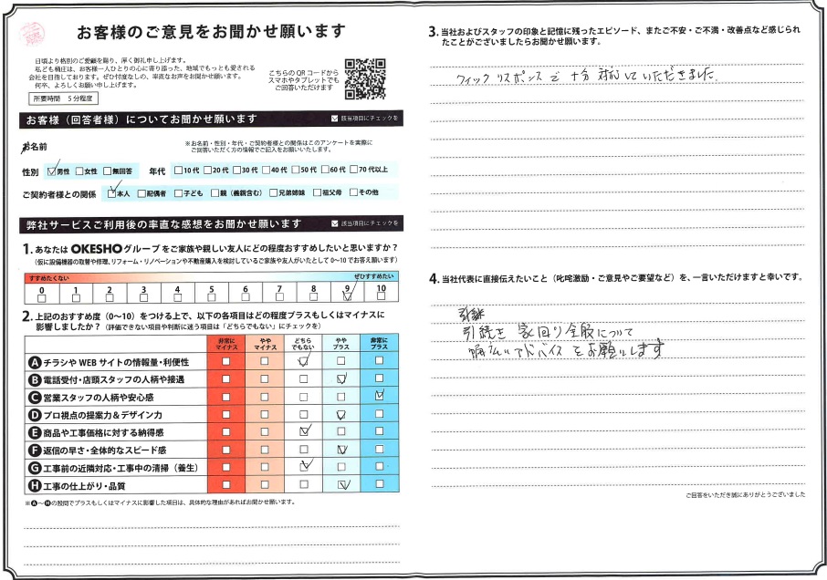 当社およびスタッフの印象と記憶に残ったエピソード、またご不安・ご不満・改善点など感じられたことがございましたらお聞かせ願います。