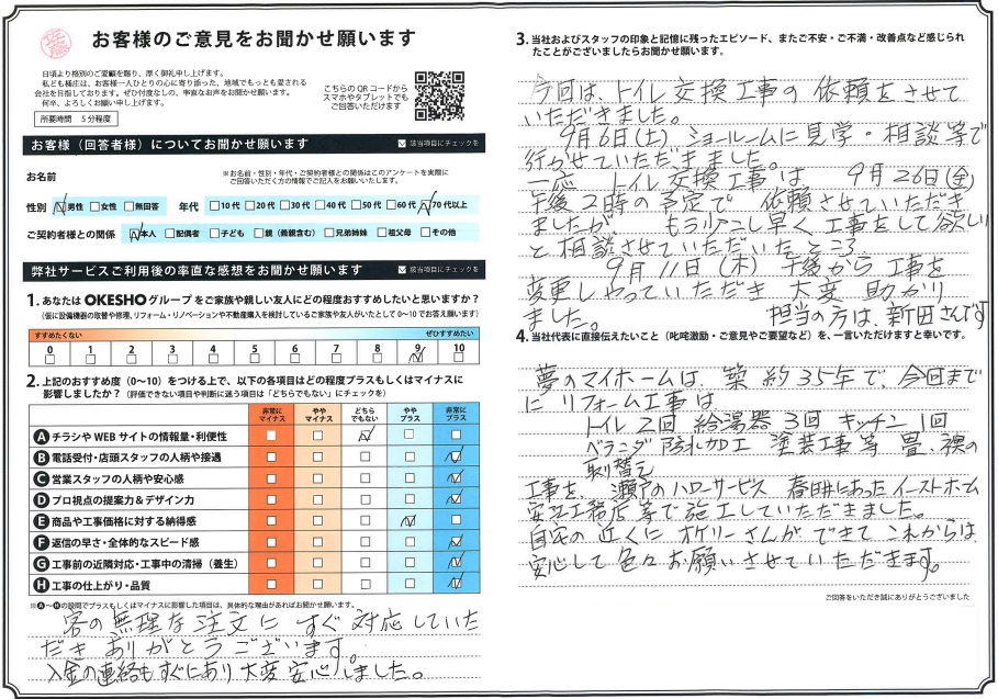 当社およびスタッフの印象と記憶に残ったエピソード、またご不安・ご不満・改善点など感じられたことがございましたらお聞かせ願います。