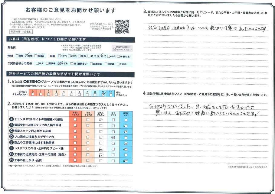 当社およびスタッフの印象と記憶に残ったエピソード、またご不安・ご不満・改善点など感じられたことがございましたらお聞かせ願います。