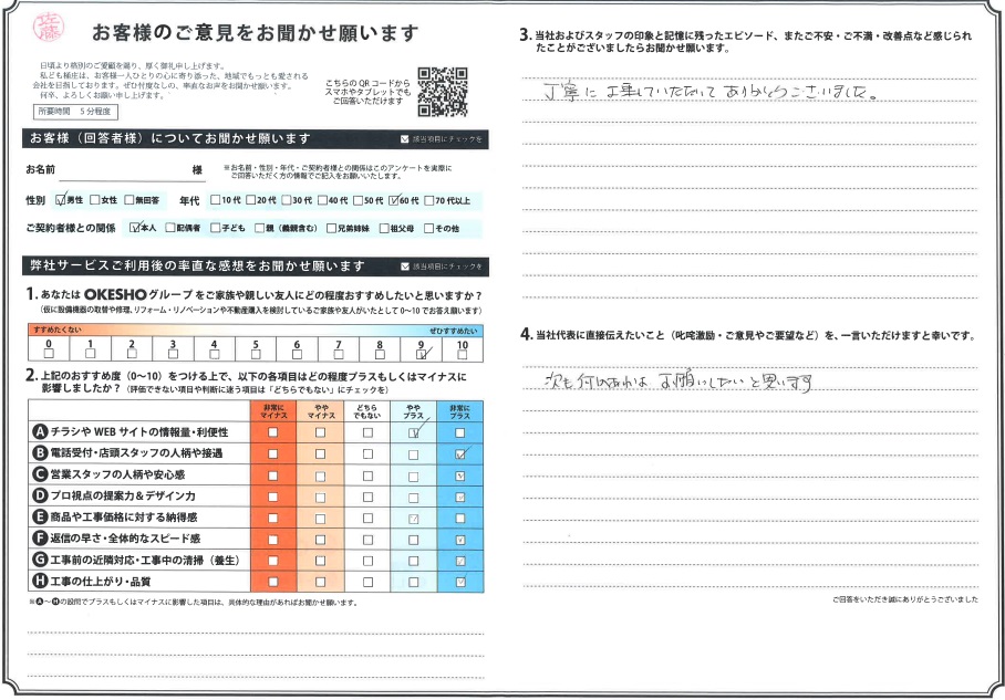 当社およびスタッフの印象と記憶に残ったエピソード、またご不安・ご不満・改善点など感じられたことがございましたらお聞かせ願います。