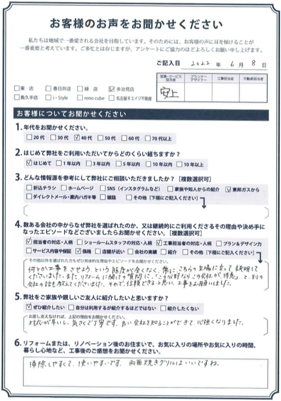 何とか工事をさせよう という態度が全くなく、常にこちらの立場に立って説明してくださいました。また、リフォームに関しての質問に「この分野なら この会社が得意」と別の会社の話も教えてくださいました。それで 信頼できる と思い、工事をお願いしました。