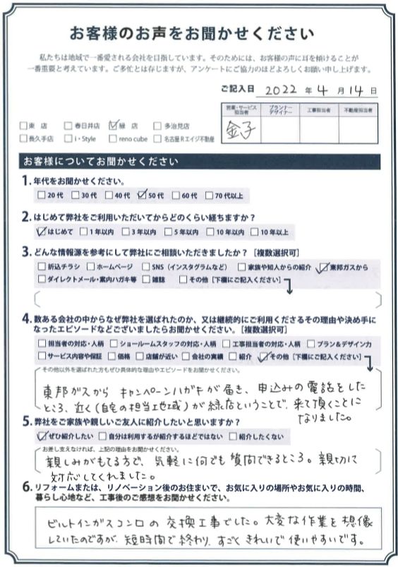 東邦ガスからキャンペーンハガキが届き、申込みの電話をしたところ、近く(自宅の担当地域)が緑店ということで来て頂くことになりました。