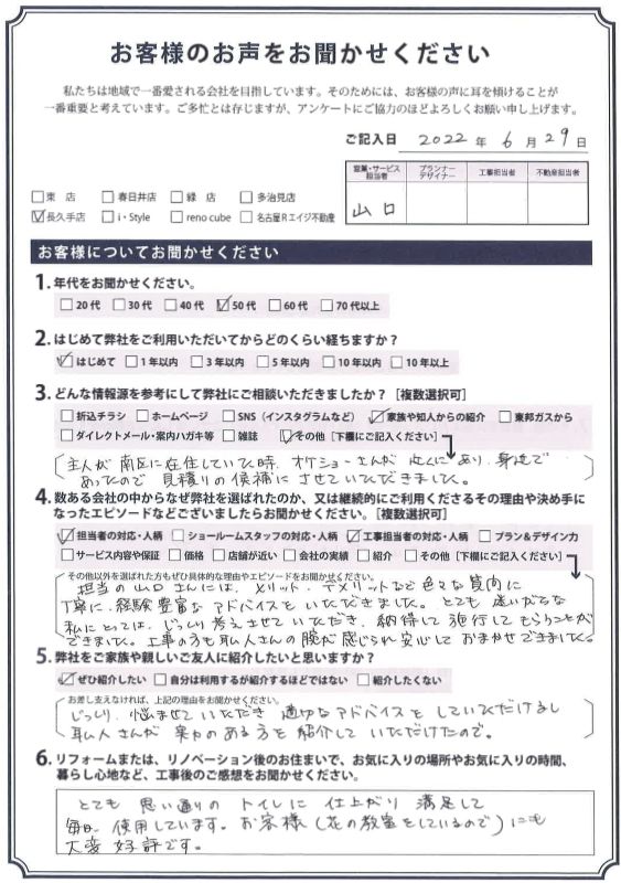 担当の山口さんには、メリット・デメリットなど色々な質問に丁寧に 経験豊富なアドバスをいただきました。とても迷いがちな私にとっては じっくり考えさせていただき、納得して施工してもらうことができました。工事の方も職人さんの腕が感じられ安心しておまかせできました。