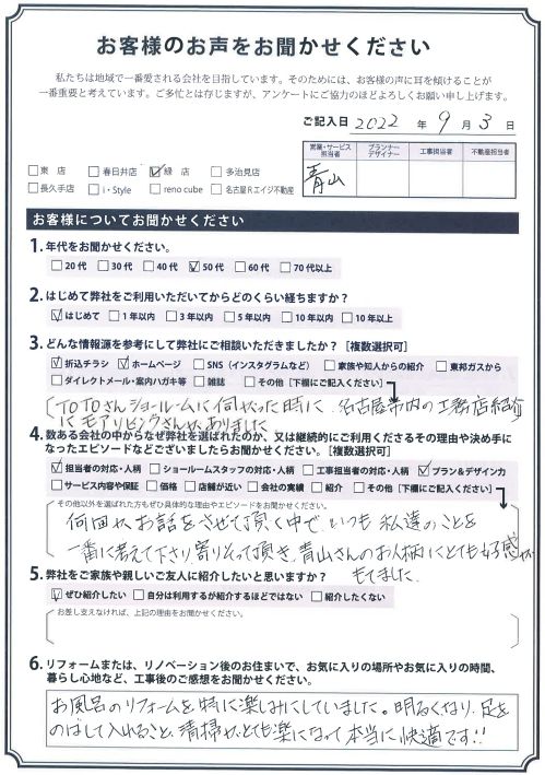 何回かお電話をさせて頂く中で いつも私達のことを一番に考えて下さり寄りそって頂き、青山さんのお人柄にとても好感がもてました。
