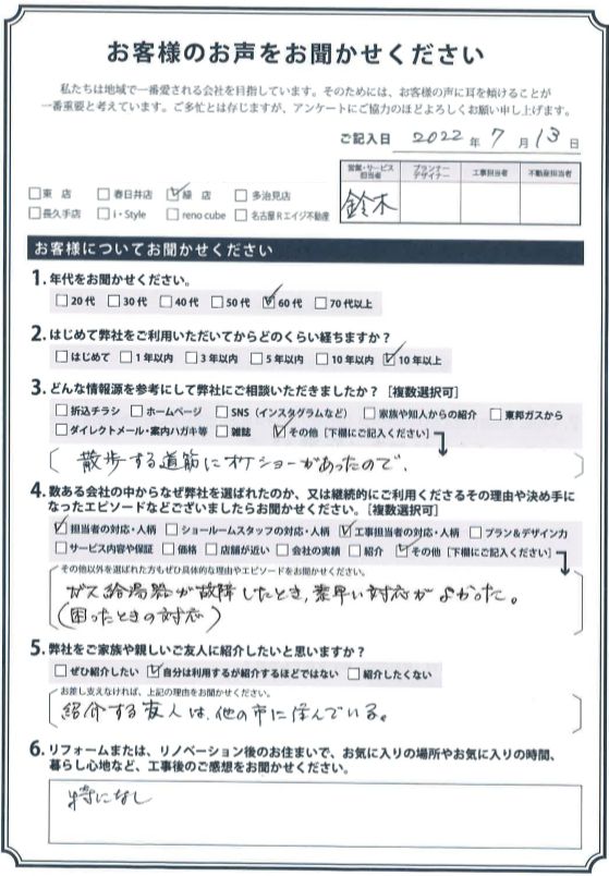ガス給湯器が故障したとき、素早い対応がよかった。(困ったときの対応)