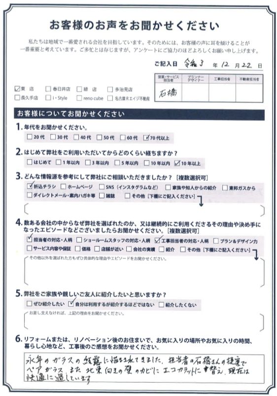 永年のガラスの結露に悩まされてきました。担当者の石橋さんの提案でペアガラス。また北東向きの壁のカビにエコカラットに替え、現在は快適に過しています。
