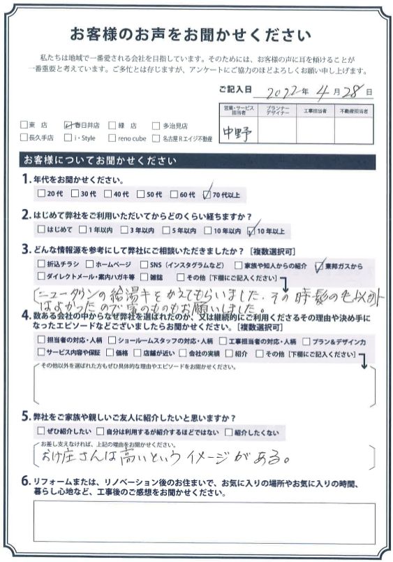 ニュータウンの給湯器をかえてもらいました。その時 髪の毛以外はよかったので 家のものもお願いしました。