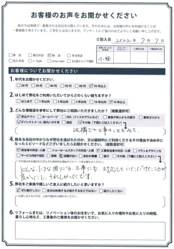 どんな小さな困りごと、工事にも対応していただけたことが良かったし、うれしかったです。