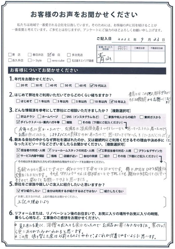 高齢のひとり暮らしですので何かにつけて不安なことばかりです。特にガスはひとつ間違うと大変なことになります。その点”オケショウ”さんは些細なことでTELしても親切に対応してくださいますので、安心してお願いできると思いました。