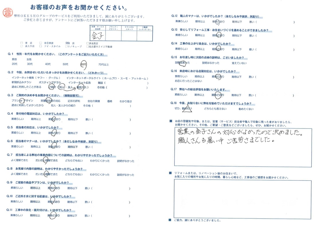お店の雰囲気や印象。または、営業(サービス)担当者や職人で印象に残った者がおりましたら、お聞かせください。その他、ご要望・ご意見などございましたら、ぜひ、お聞かせください。
