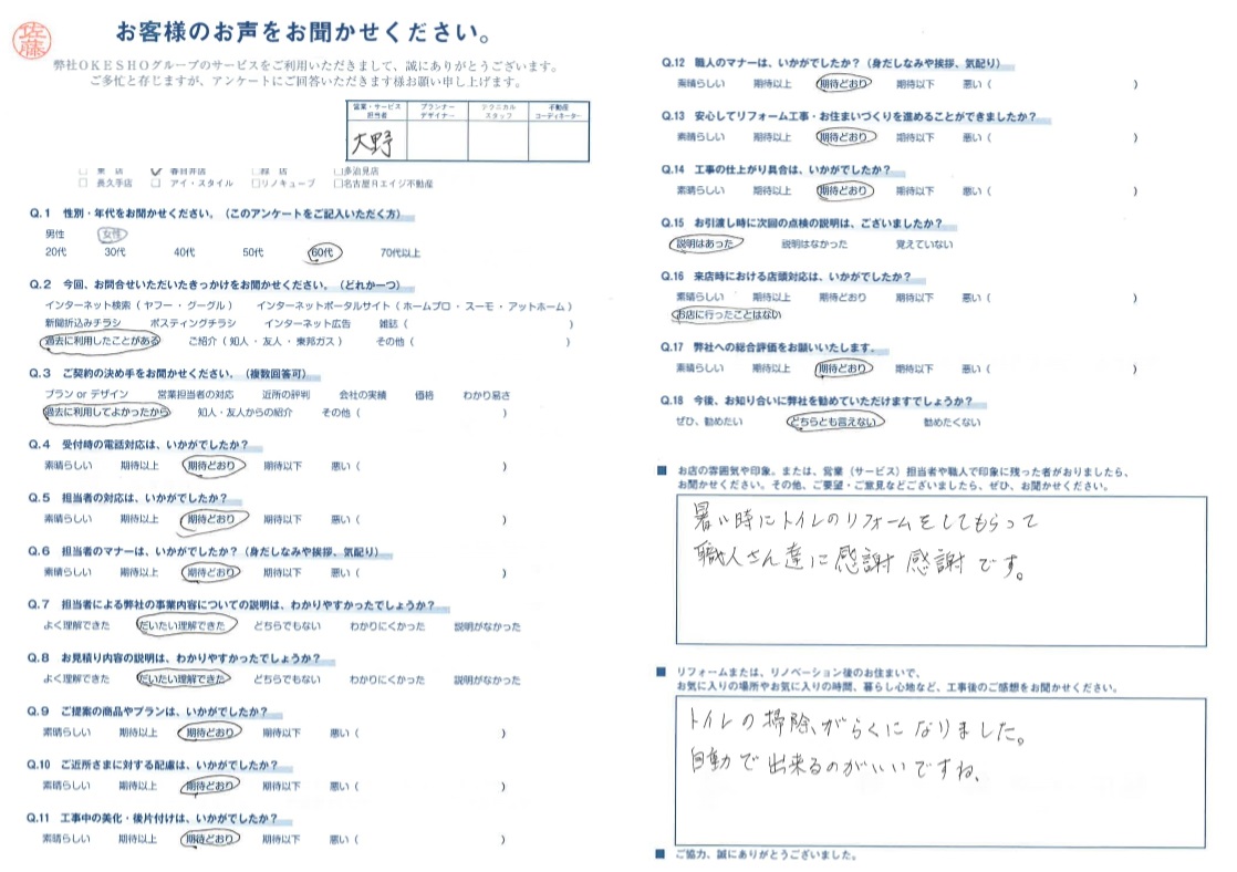 お店の雰囲気や印象。または、営業(サービス)担当者や職人で印象に残った者がおりましたら、お聞かせください。その他、ご要望・ご意見などございましたら、ぜひ、お聞かせください。