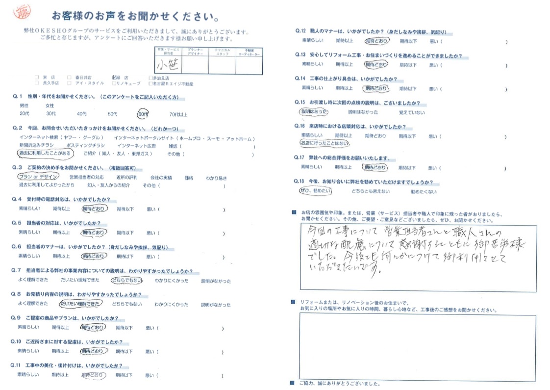 今回の工事について 営業担当者さんと職人さんの適切な配慮について感謝するとともに 御苦労様でした。今後とも何かにつけて御利用させていただきたいです。