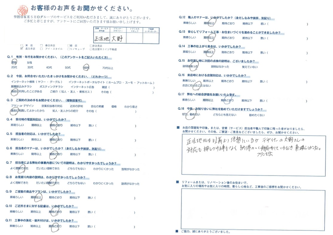 正法地さんは以前より信頼しているが、デザイナーの大野さんの対応も 押しつける事もなく納得のいくプランを出していただき 素晴らしかった。