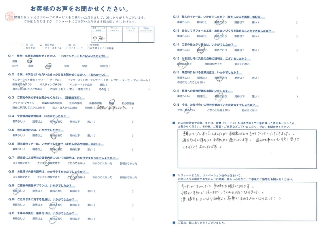 予算より少しオーバーしましたが 想像以上のものをつくっていただきました。毎日キレイを保ちつつ気持ちよく過ごしています。追加工事とかも快く受けていただいて よかったです。