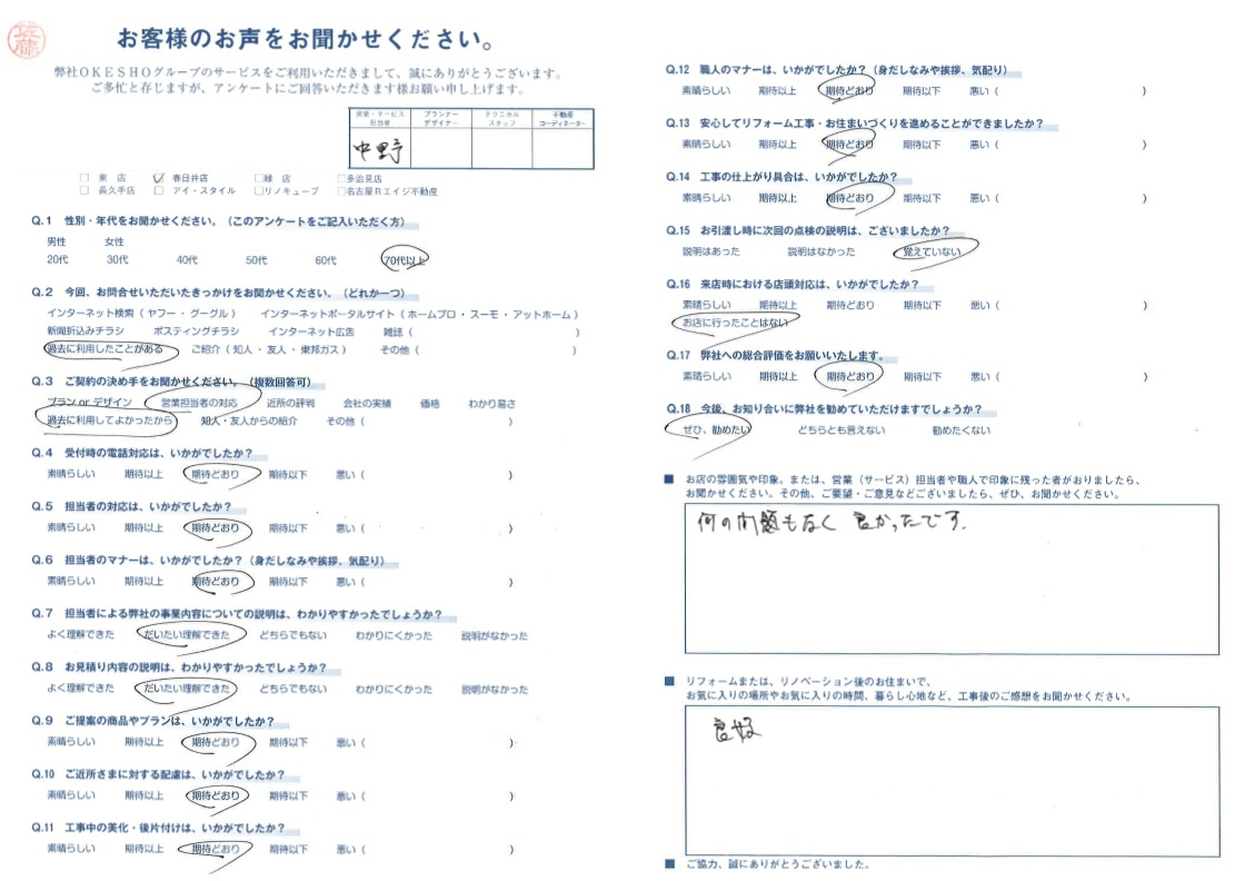 お店の雰囲気や印象。または、営業(サービス)担当者や職人で印象に残った者がおりましたら、お聞かせください。その他、ご要望・ご意見などございましたら、ぜひ、お聞かせください。