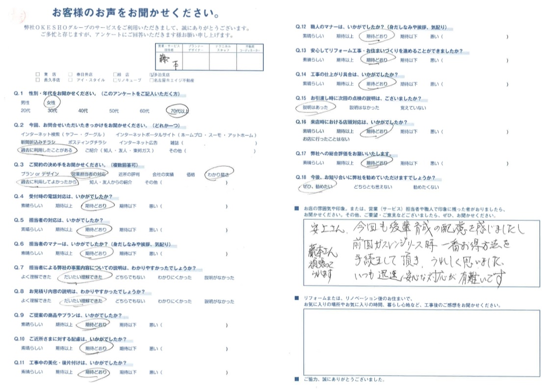 お店の雰囲気や印象。または、営業(サービス)担当者や職人で印象に残った者がおりましたら、お聞かせください。その他、ご要望・ご意見などございましたら、ぜひ、お聞かせください。