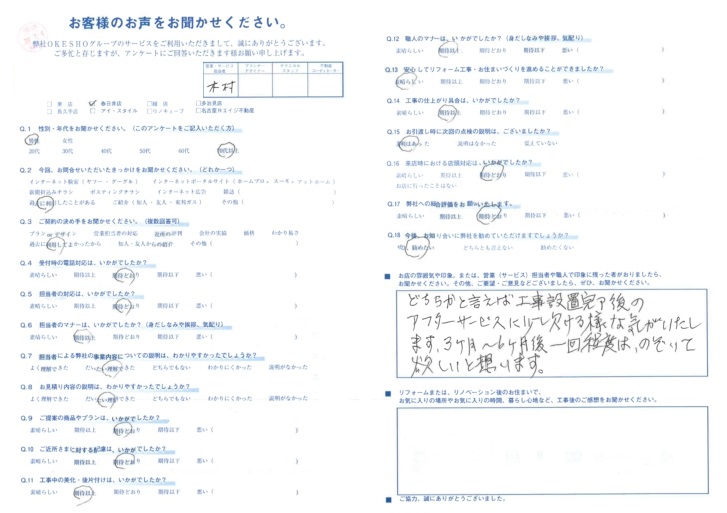 どちらかと言えば工事設置完了後のアフターサービスに少し欠ける様な気がいたします。3ヶ月~6ヶ月後 一回程度はのぞいて欲しいと想います。