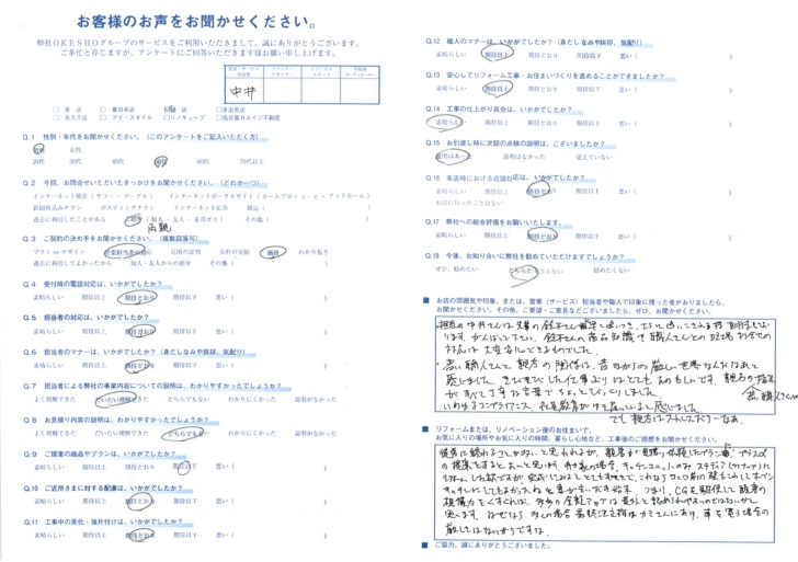 ・担当の中井さんは 先輩の鈴木さんに早く追いつき、さらに追いこされる様期待しております。がんばって下さい。鈴木さんの商品知識や職人さんとの現場打合せの対応は、大変安心できるものでした。