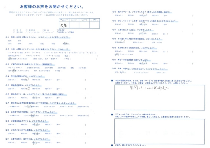 お店の雰囲気や印象。または、営業(サービス)担当者や職人で印象に残った者がおりましたら、お聞かせください。その他、ご要望・ご意見などございましたら、ぜひ、お聞かせください。