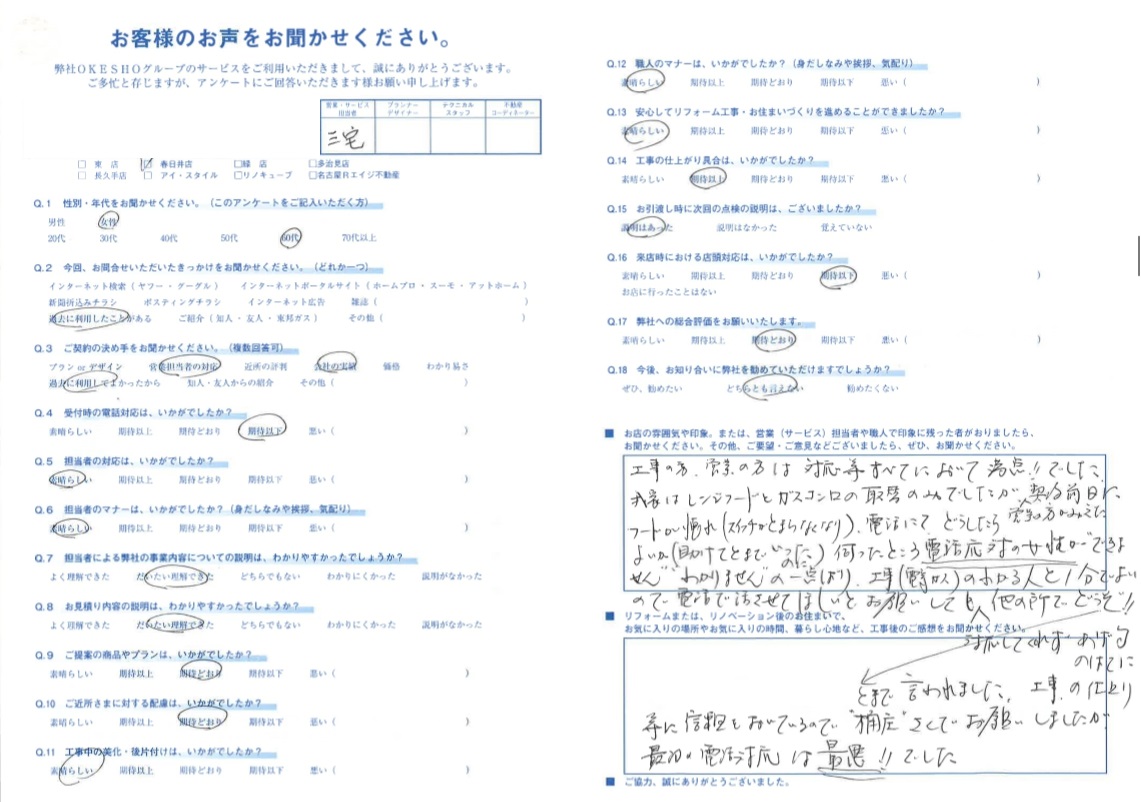 我家はレンジフードとガスコンロの取替のみでしたが、営業の方がみえた契約前日にフードが壊れ(スイッチがとまらなくなり)電話にて どうしたらよいか(助けてとまでいったのに)伺ったところ 電話応対の女性が”できません””わかりません”の一点ばり。工事(電気ガス)のわかる人と1分でよいので電話で話させてほしいとお願いしても対応してくれず あげ句のはてに他の所でどうぞ‼とまで言われました。工事の仕上り等に信頼をおいているので”桶庄”さんでお願いしましたが 最初の電話対応は最悪‼でした。
