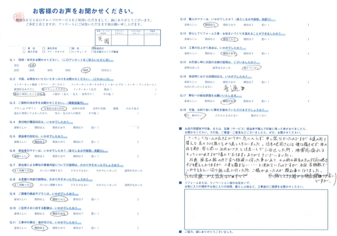 キッチンリフォームの出き上がりが気に入らず、申し訳なかったのですが 水道の取り替えと 床のクロス張りをやり直してもらいました。担当の光岡さんは嫌な顔もせず 客の話を聞き、寄り添い、信用ができ、とても良い人で お任せした所、清潔感溢れるキッチンが出き上がり喜んでおります。ありがとうございました。