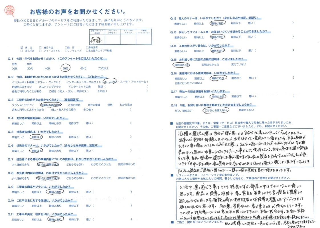 入浴中、寒く感じる事はとても残念ですが、部屋の中はきれいなので嬉しく思います。商品の提案の段階で 客の意見を否定してでも良い商品を提案して欲しかったなと思います。面談の時に使用する者の体格等を考慮したアドバイスをして欲しかったなと思います。今は寒い季節なので 春が来るのを心待ちにしています。