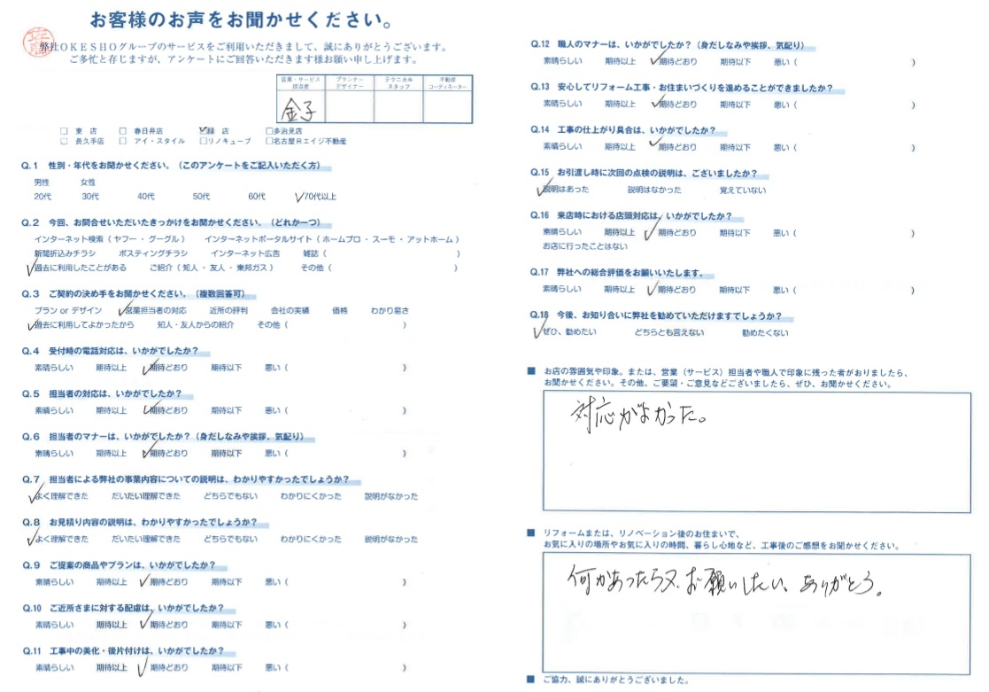 お店の雰囲気や印象。または、営業(サービス)担当者や職人で印象に残った者がおりましたら、お聞かせください。その他、ご要望・ご意見などございましたら、ぜひ、お聞かせください。