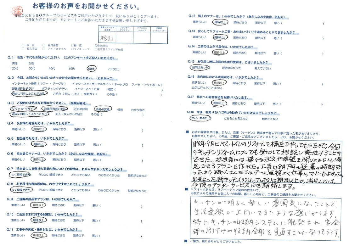 昨年9月にバス・トイレのリフォームを桶庄でやってもらったので、今回のキッチンリフォームについても安心して相談し発注することができた。担当者には様々な注文や希望を聞いてもらい、満足できるプランを作れた。工事は8月下旬の猛暑の時期だったが、職人さんたちはチーム連携よく仕事し、マナーもよかった。