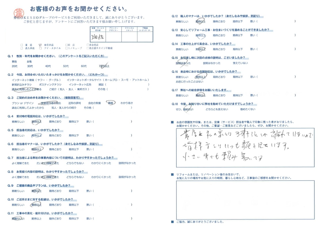 お店の雰囲気や印象。または、営業(サービス)担当者や職人で印象に残った者がおりましたら、お聞かせください。その他、ご要望・ご意見などございましたら、ぜひ、お聞かせください。
