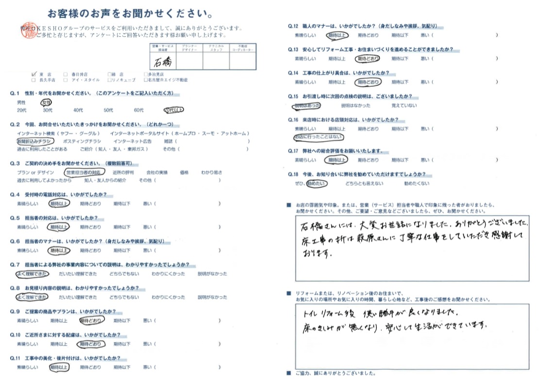 お店の雰囲気や印象。または、営業(サービス)担当者や職人で印象に残った者がおりましたら、お聞かせください。その他、ご要望・ご意見などございましたら、ぜひ、お聞かせください。