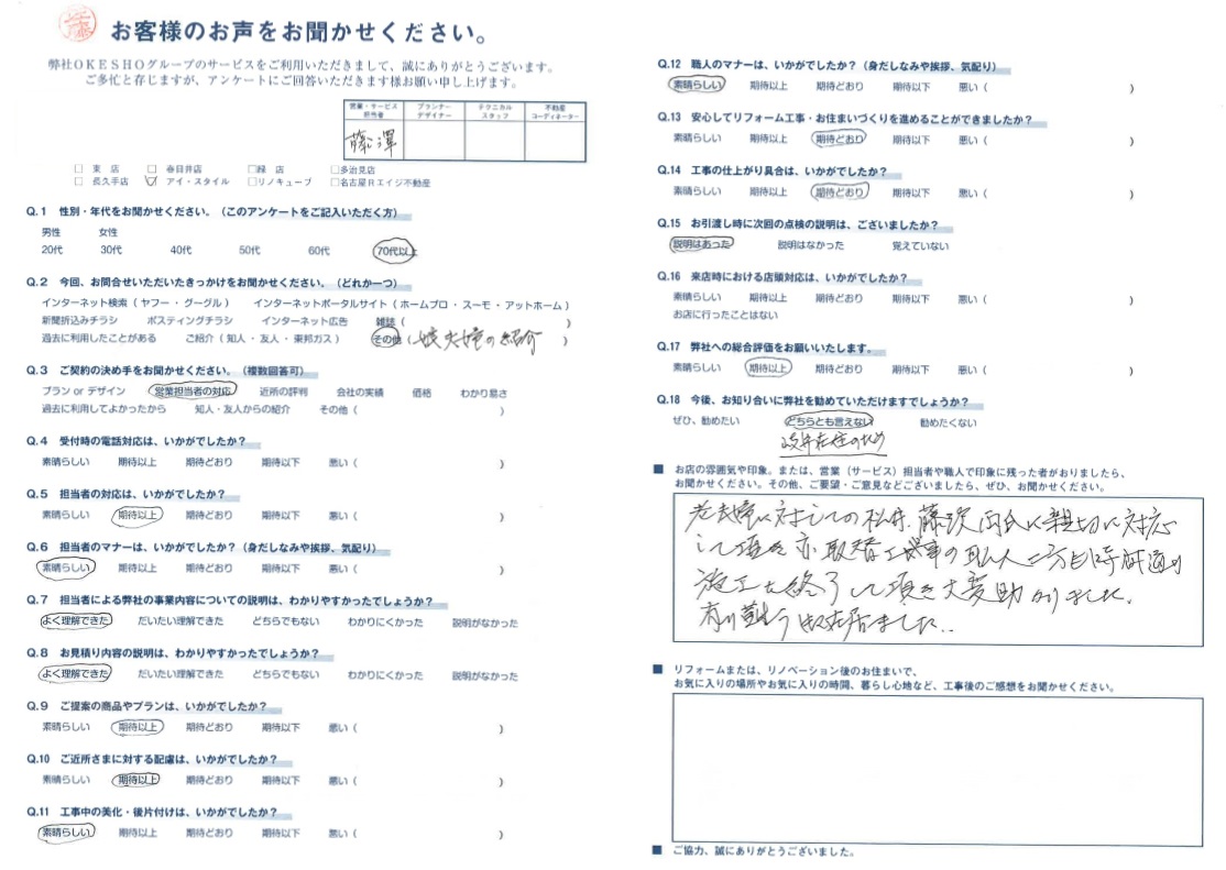 老夫婦に対しての松井・藤沢両氏に親切に対応して頂き 亦 取替工事の職人二人も時間通り施工を終了して頂き大変助かりました。