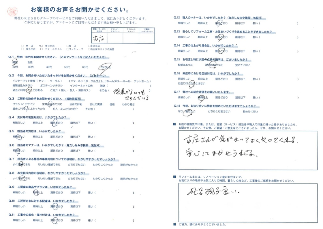 お店の雰囲気や印象。または、営業(サービス)担当者や職人で印象に残った者がおりましたら、お聞かせください。その他、ご要望・ご意見などございましたら、ぜひ、お聞かせください。