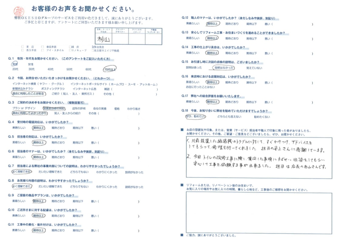 2.今回 トイレの改修工事に際し、質問した事項にすばやい回答をしてもらい安心して工事を依頼する事が出来ました。担当は店長の杉山さんです。
