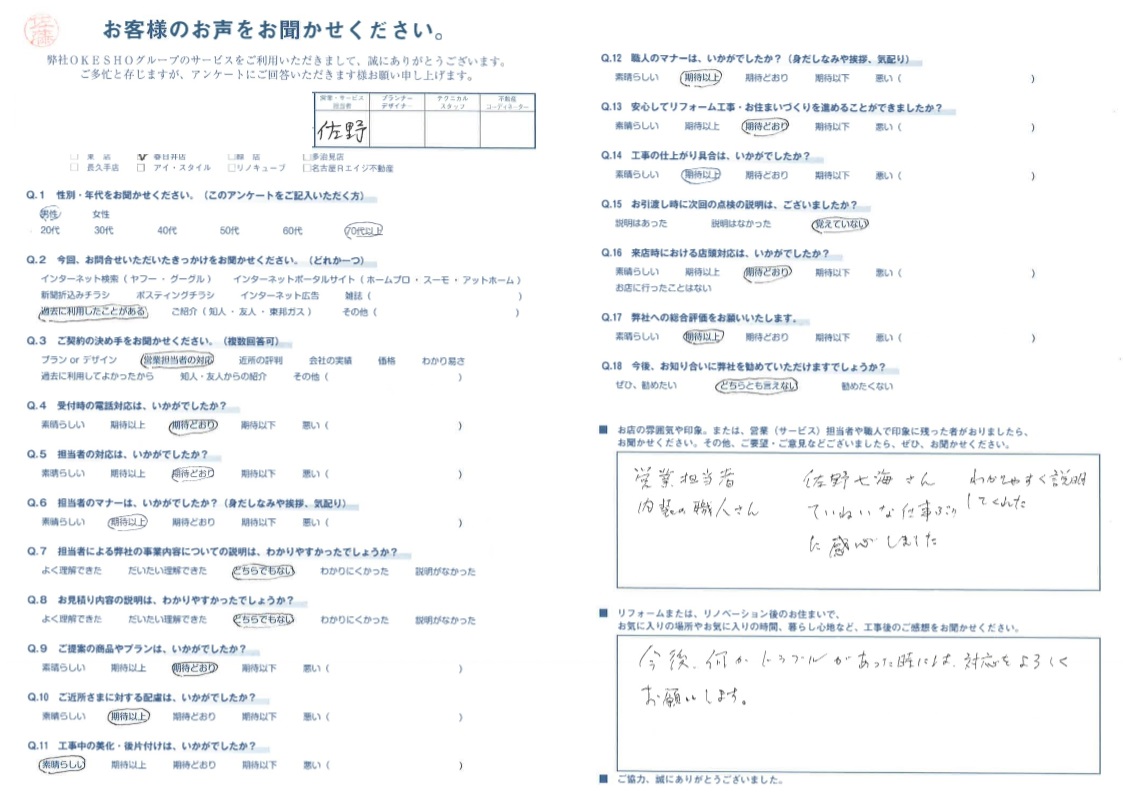 お店の雰囲気や印象。または、営業(サービス)担当者や職人で印象に残った者がおりましたら、お聞かせください。その他、ご要望・ご意見などございましたら、ぜひ、お聞かせください。
